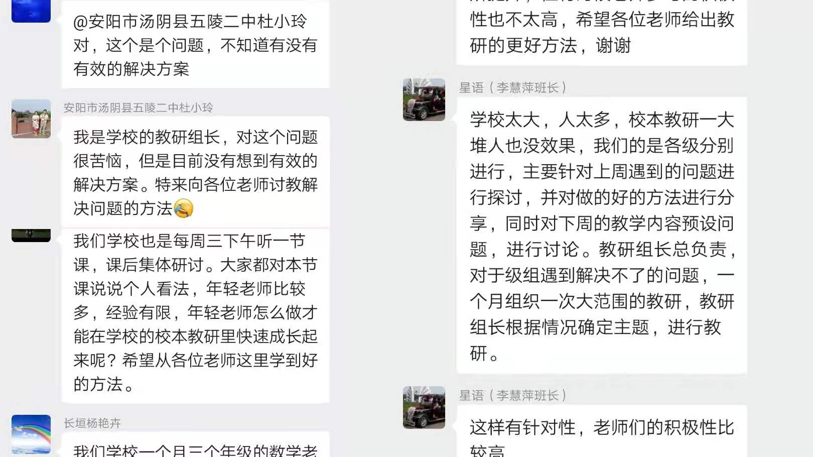 529日下午,班主任刘晓盼老师带领学员们进行主题讨论《如何开展校本教研》。班主任老师在群里让老师讨论关于校本教研的看法?学员们踊跃发言,不仅说了自己学校的校本教研模式,也指出了其中的不足。大家受上午曹老师报告的启发,互相讨论,提出了很多改进的建议。