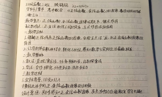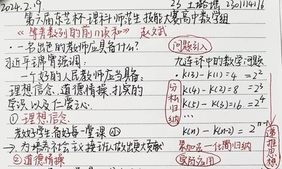 本次活动以线上形式开展,为期一个月,以教师基本功为立足点,内容丰富详实,包括普通话练习、高考题解答、三笔字练习、优质课观摩笔记等模块。活动要求学生定期提交作品,相关部门负责审核,每周选出优秀作品进行展出。字正腔圆的朗诵片段、逻辑清晰的真题详解、工整美观的字迹作品、详细认真的教学笔记,充分展示了数院师范生的爱教从教热情和励精笃行的青春风采。2022级在校生华语菲表示,训练结束后自身对数学教学技能要求有了更全面的认识,收获了新的教学方法和班主任工作技巧,而且在板书技能方面得到显著提升。