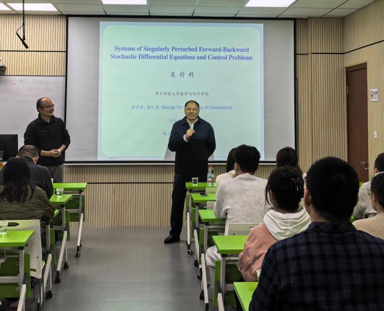本次报告聚焦于一类奇异摄动的前向-后向随机微分方程(FBSDEs),其特点是包含了一个“慢”尺度和一个“快”尺度。吴教授及其合作者放宽了对系统系数的正则性要求,研究了此类方程的平均化原理。从而,将原始的复杂快慢系统简化为一个“平均”系统,并严格证明了原始系统解的收敛性。最后,将其应用于奇异摄动的随机控制问题。
