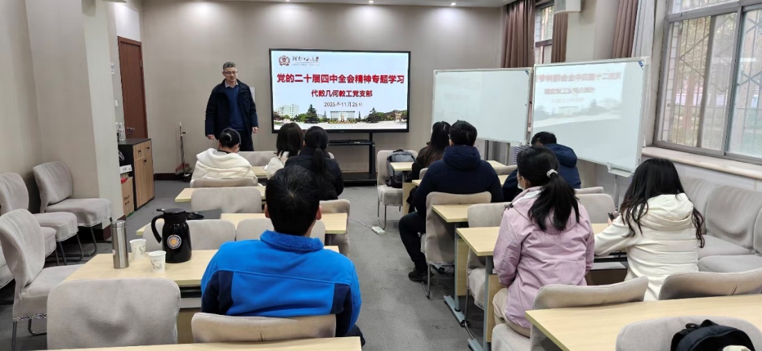11月25日下午,代数几何教工党支部在学院103教室召开专题学习会,集中学习党的二十届四中全会精神。支部全体党员参加,会议由支部书记陈光周主持。