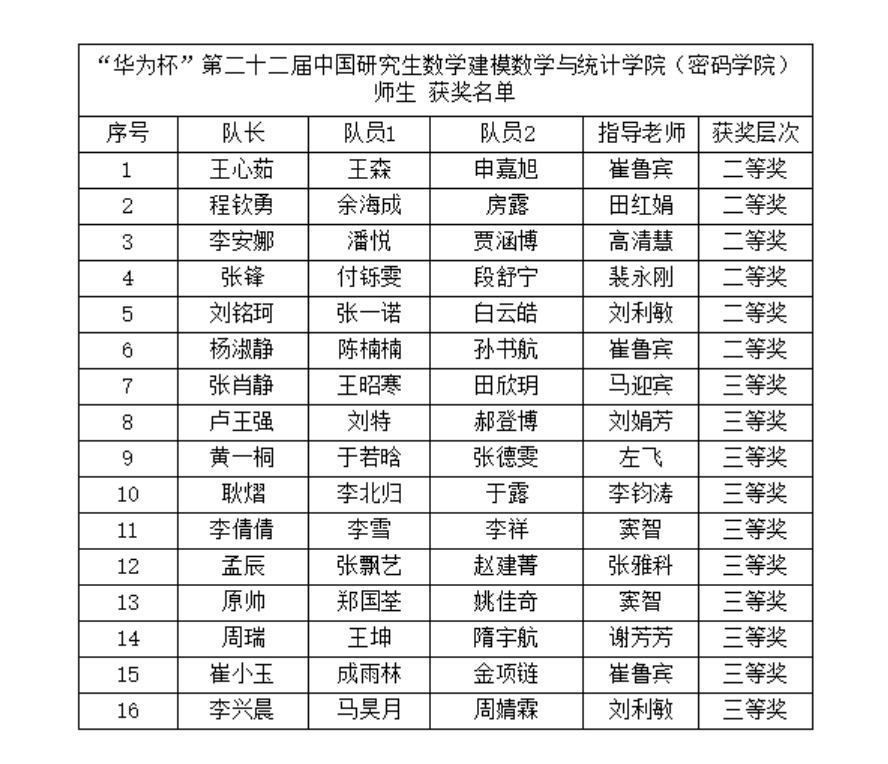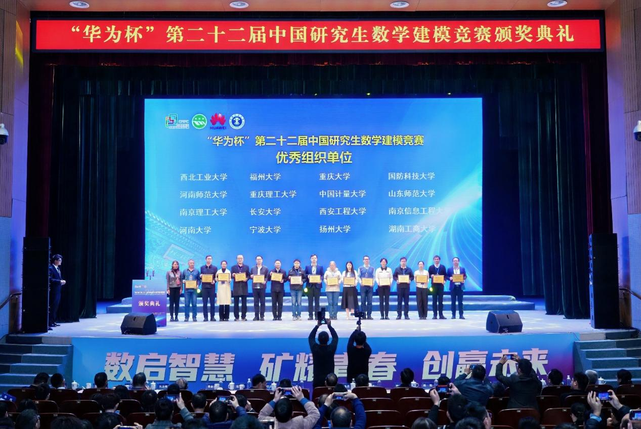 12月5日至7日,“华为杯”第二十二届中国研究生数学建模竞赛颁奖大会在中国矿业大学隆重举行。本届赛事中,我校荣获一等奖2项、二等奖19项、三等奖25项,获奖层次和获奖数量均实现历史性突破。学校凭借出色的组织工作和优异的竞赛成绩,荣获“第二十二届中国研究生数学建模竞赛优秀组织奖”,成为全国65所获此殊荣的高校之一。数学与统计学院(密码学院)教师崔鲁宾被授予“先进个人”荣誉称号,充分展现了我校在研究生创新实践能力培养方面的扎实成效。
