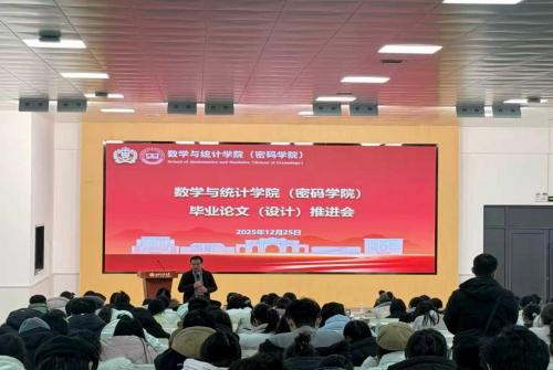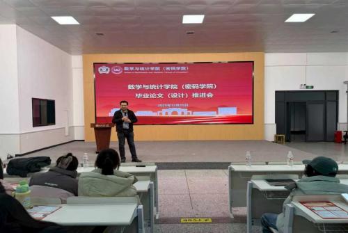 为提升本科生科研实践与写作能力,推动毕业论文高质量完成,12月25日下午,数学与统计学院(密码学院)于学苑餐厅三楼树蕙堂召开毕业论文(设计)推进会。会议邀请教学副院长崔鲁宾主讲,由2022级辅导员牛志雅主持,2022级辅导员袁刚及学院全体毕业生参会。