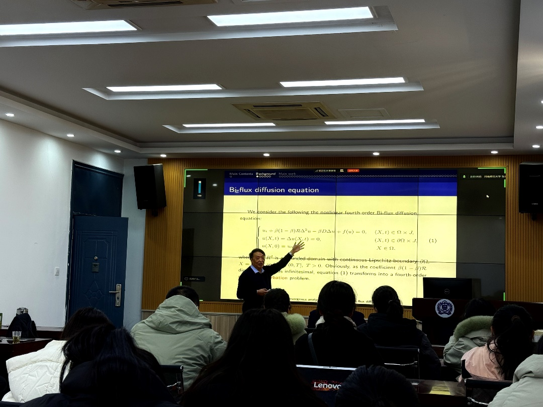1月11日上午,应数学与统计学院邀请,郑州大学石东洋教授为我院师生作题为“Superconvergence analysis of FEMs for the Bi-flux diffusion models”的学术报告。报告会由学院副院长李海锋教授主持。