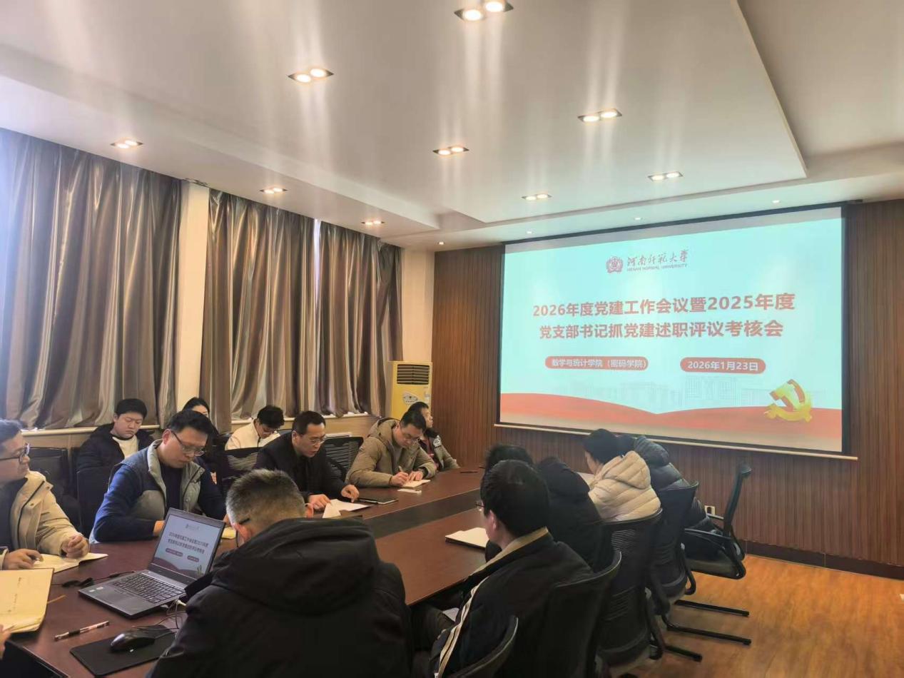 为深入贯彻落实新时代党的建设总要求,提升基层党组织的战斗堡垒作用,推动基层党组织建设全面进步、全面过硬,1月23日下午,数学与统计学院党委在学院S207会议室召开2026年度党建工作会议暨2025年度党支部书记抓党建述职评议考核会。学院党委委员、各党支部书记和师生党员代表出席会议。会议由学院党委书记宋艳兵主持。