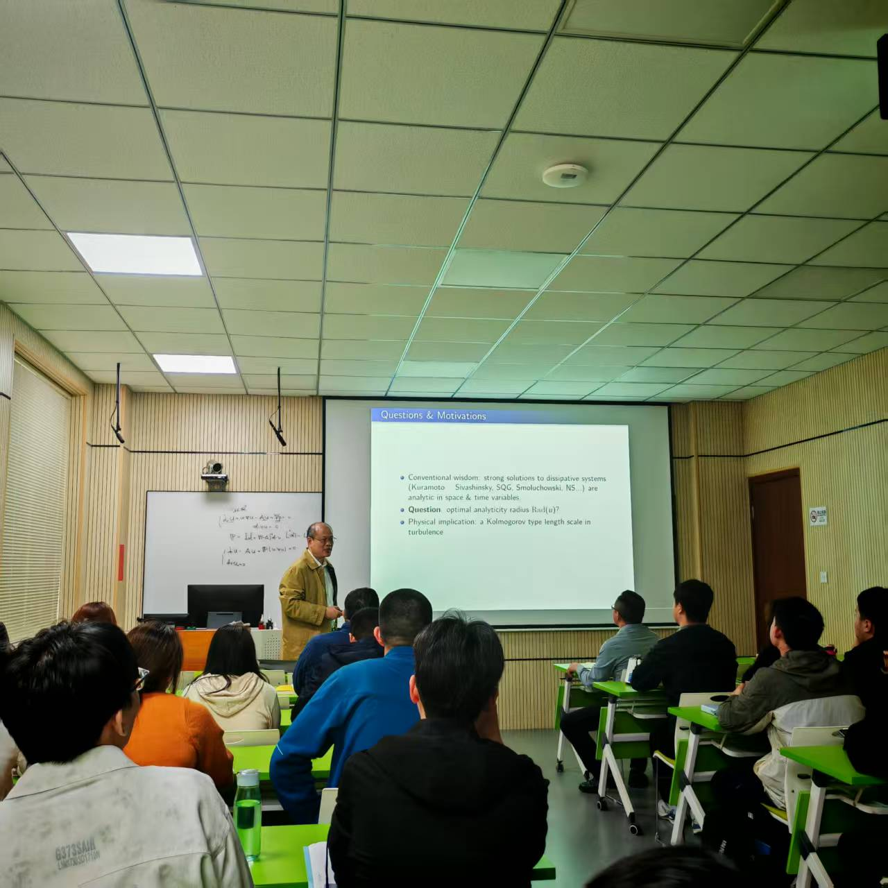 报告中,张平院士聚焦具有一般Sobolev初值的三维不可压缩Navier- Stokes方程,深入讲解了唯一局部强解的解析半径满足一个精确的下界估计,这解决了Herbst和Skibsted长达十年的猜想。张平院士在报告中以多位国际数学大师勤奋进取的经历为例,指出成功的背后离不开持之以恒的拼搏与努力。互动交流环节中,张平院士对师生们提出的问题逐一耐心解答,结合自身研究经验,围绕当前领域的前沿热点和亟待突破的技术难点与大家展开了热烈深入的探讨。现场气氛十分活跃,师生们踊跃提问、积极交流,纷纷表示收获良多。