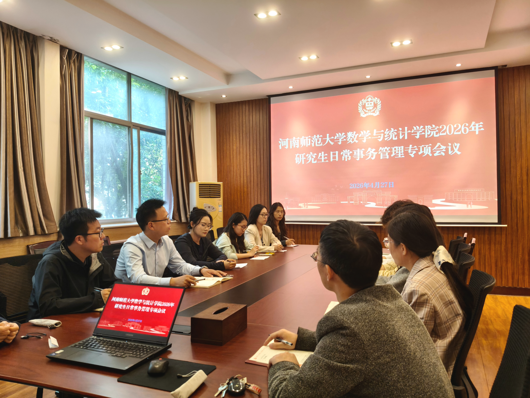 为统筹推进研究生教育管理工作,进一步明确下一阶段重点任务,凝聚师生协同育人合力,2026年4月27日,数学与统计学院(密码学院)在南楼207会议室召开研究生日常事务管理专项会议。副院长马迎宾、研究生辅导员左飞、研究生工作秘书杨启玉、路林凤老师以及全体研究生助管共同参与了此次会议。