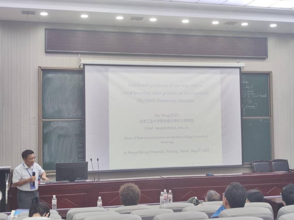8月25日,应数学与统计学院的邀请,北京工业大学王术教授在数学院报告厅为我院师生作题为 “Global well-posedness of one class of initial-boundary value problem on incompressible Navier-Stokes equations and the related models” 的学术报告。数学与统计学院师生共三十余人参加此次报告。本次报告由杨新光教授主持。王术教授研究了带边界区域内不可压缩Navier-Stokes方程组及相关模型初边值问题的整体适定性。同时,对于二维情形下的对应问题,还证明了光滑解的整体存在性与唯一性。此外,将上述结果推广至相关不可压缩流体模型,如Boussinesq方程、磁流体力学(MHD)模型及流固耦合(FSI)模型等。王术教授的报告深入浅出,与会师生受益匪浅。报告结束后,王术教授对师生提出的相关问题进行了细致地回答,交流了一些科研经验,拓宽了与会师生的学术视野。 专家简介: 王术教授,现为北京工业大学教授,博士生导师,北京工业大学数学一级学科博士学位授权点责任教授,北京市重点建设学科“应用数学”学科负责人,中国工业与应用数学会理事,国家留学基金委会议评审专家,国家自然科学基金会评审专家。曾任中国数学会理事、北京工业大学应用数理学院院长等职务。主要研究:偏微分方程及其应用。现主持或曾主持国家自然科学基金 8 项(含重点项目 1 项),独立获得北京市科学技术奖二等奖 1 项,出版著作 3 部,在 Adv. In Math., ARMA, SIAM J Math Anal, CPDE, J. Diff. Eqns 等杂志发表 SCI 收录学术论文 250 余篇。 (数学与统计学院 杨新光 崔鲁宾 李宛唐)