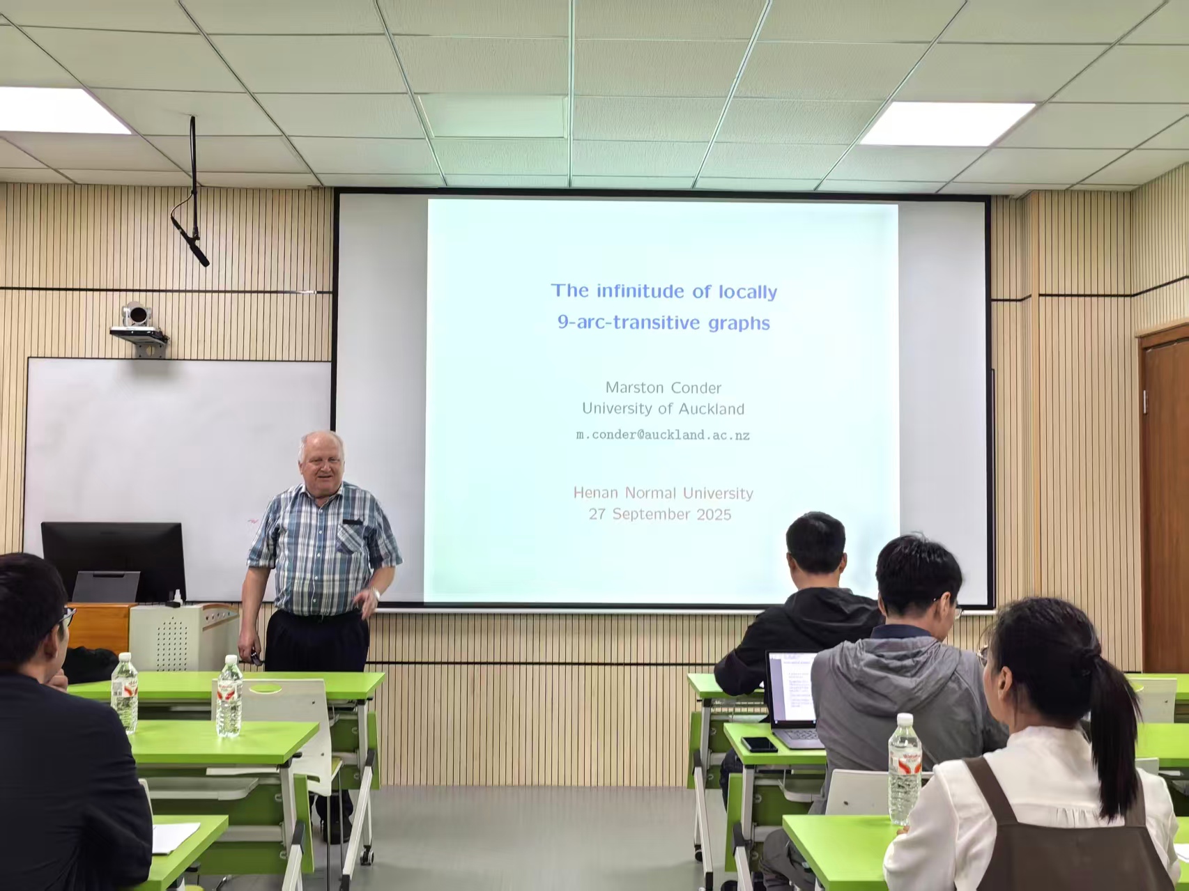 9月27日,应数学与统计学院的邀请,新西兰奥克兰大学杰出教授Marston Conder为学院师生作题为“The infinitude of locally 9-arc-transitive graphs”的学术报告,相关专业教师及研究生20余人参加了此次报告。 Conder教授首先从图论中弧传递性的经典结论出发,引出局部s-弧传递图的概念及其上界猜想,并介绍了目前已知的最小满足s=9的图例。针对“是否存在更多不依赖于广义八边形的此类图”这一公开问题,给出肯定答案。证明了对几乎所有正整数n,都存在一个自同构群为交错群A_n的局部9-弧传递的二部图。 报告内容深入浅出,引发了师生的热烈讨论。此次报告有效促进了我院在图论与群论交叉领域的学术交流。 专家简介: Marston Conder是新西兰奥克兰大学杰出数学教授,新西兰科学院院士,国际代数图论方向领头人。现为新西兰皇家学会会士和美国数学会会士,曾获包括组合数学及应用协会欧拉奖章在内的多项殊荣。曾任新西兰皇家科学院院长、新西兰皇家学会副主席、新西兰数学会理事长、新西兰数学及应用研究所所长,奥克兰大学副校长、代数领域顶级期编委。已发表SCI论文200余篇,其中多篇发表在数学领域顶级期刊。主要从事群论、组合论、代数计算、地图、多面体等领域研究。 (数学与统计学院 赵潇) |