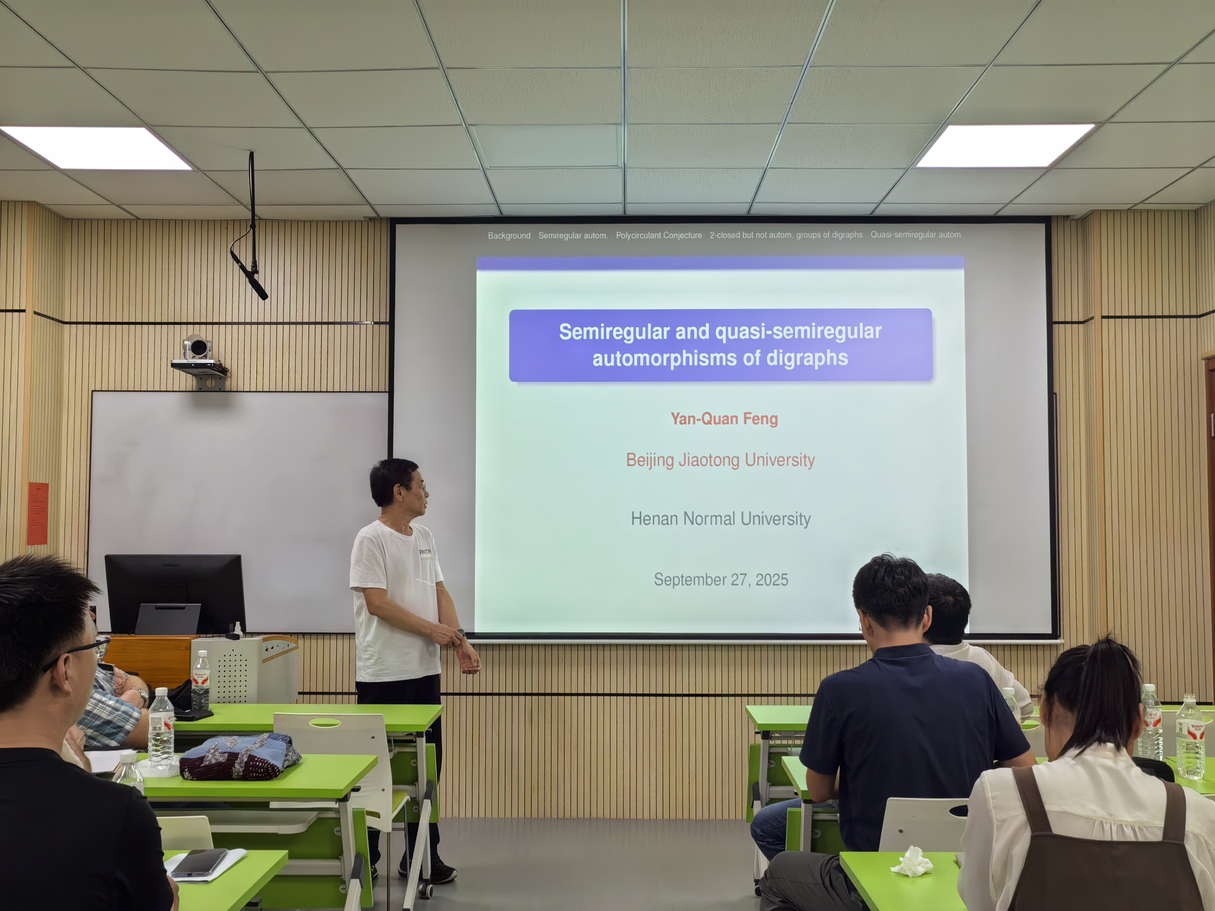 9月27日,应数学与信息科学学院邀请,北京交通大学博士生导师冯衍全教授为学院师生作题为“Semiregular and quasi-semiregular automorphisms of digraphs”的学术报告,相关专业教师和硕士研究生30余人参加此次报告。 本次报告冯教授通过有向图的自同构与置换群介绍了如何从群论中抽象出图论问题以及从图论中引出群论的问题和结果。冯教授首先用形象的语言介绍了相关背景与定义;接着引出了一个著名的Polycirculant猜想:每个度至少为2的2-闭传递置换群都有一个半正则元,并列出了其相关的研究与进展;随后给出了关于“一个置换群是正则2-闭置换群但不是一个(有向)图的自同构群”的最近研究进展;最后给出了拟半正则自同构群的相关定义及结果。 报告结束后,冯教授对师生提出的相关问题进行了细致地回答。 专家简介: 冯衍全,北京交通大学二级教授,自1997年获北京大学理学博士学位以来,一直从事代数与组合,群与图以及互联网络方面研究。曾任中国工业与应用数学学会理事、中国数学会理事、北京市数学会常务理事等。担任国际代数组合期刊Journal of Algebraic Combinatorics等杂志编委。2010年主持《图的对称性》获教育部优秀成果二等奖,2011年获政府特殊津贴。在Journal of Combinatorial Theory, Series A、Journal of Combinatorial Theory, Series B、Journal of Algebra等国际著名刊物上发表SCI科研论文100余篇,主持国家自然科学基金项目10余项,其中重点项目2项、国际合作研究项目1项。 (数学与统计学院 高焰红) |