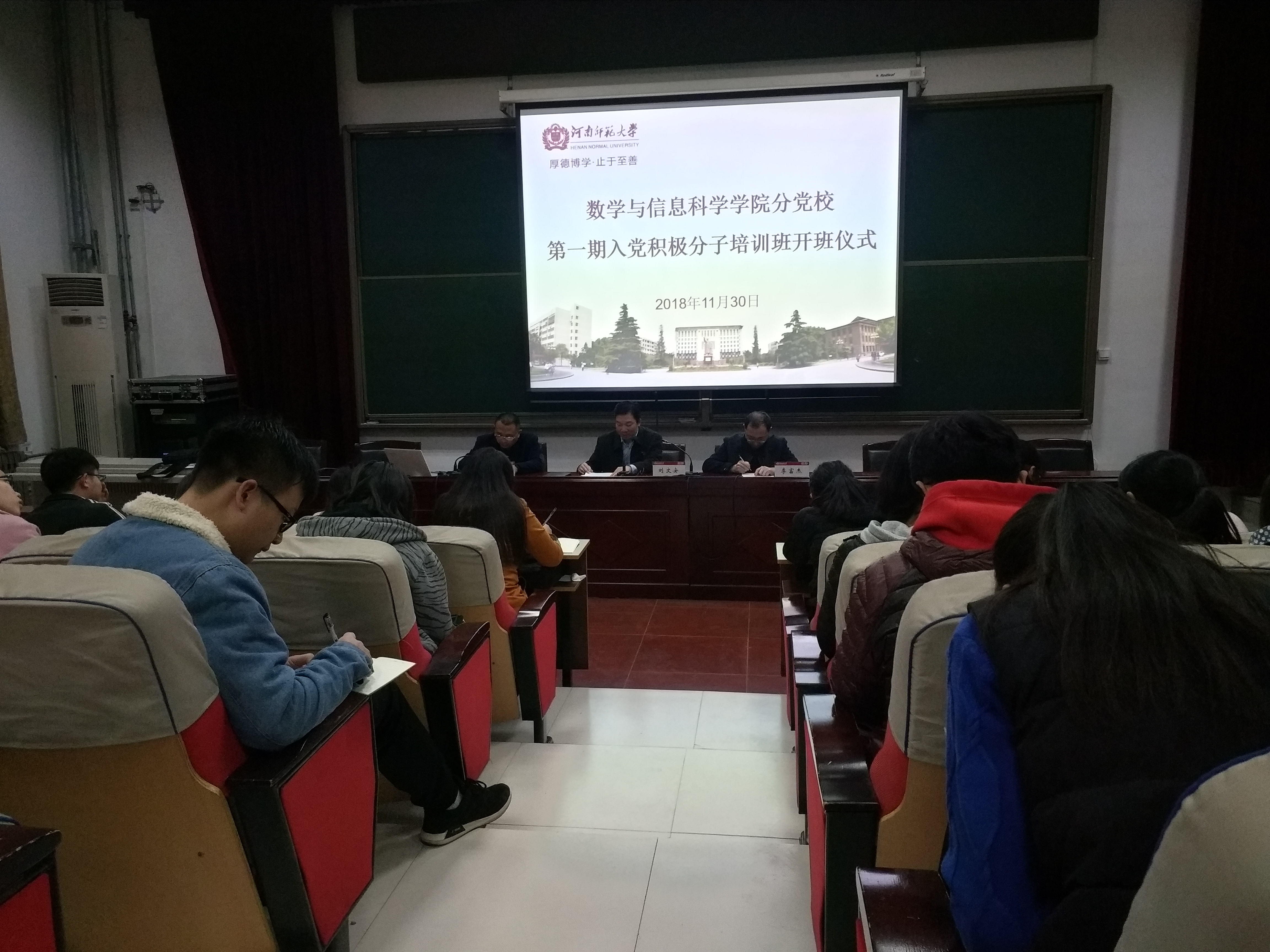 11月30日晚上,数学与信息科学学院分党校第一期入党积极分子培训班在学院报告厅举行开班仪式。学院相关负责人、55名培训学员参加了开班仪式。开班仪式由学院党委副书记李富杰主持。