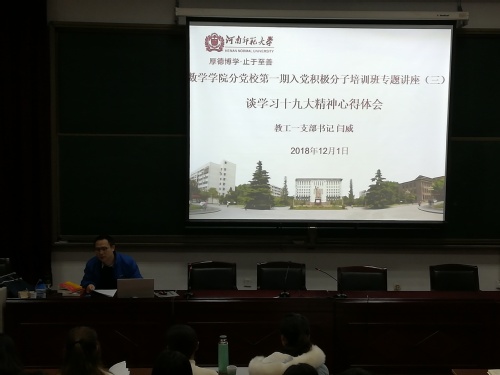 闫威以“学习十九大精神” 为主题,结合自身工作经历,引导入党积极分子不忘初心、牢记使命,将个人理想融入新时代,把崇高理想落实到日常的具体行动中,并祝愿大家都能通过自身努力早日加入党组织。并且从学生提出的关于生活和学习的现实困惑和问题入手,帮助学生细致分析,一一耐心解答。