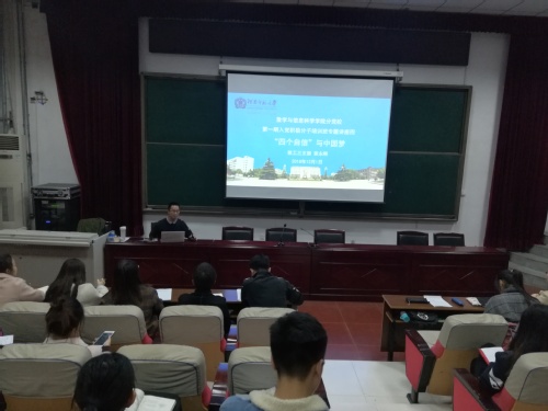 12月1日晚上,数学学院党支部书记裴永刚应邀为我院入党积极分子作“‘四个自信’与中国梦”专题讲座,讲座在数学院报告厅举行。