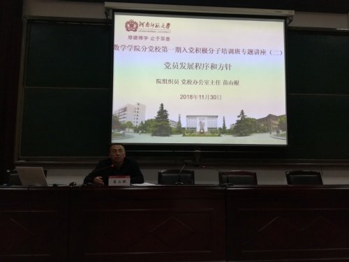 12月2日晚上,数学与信息科学学院分党校第一期学生入党积极分子培训班第四讲在数学院报告厅举行。学院组织员苗山根为培训班学员解读共产党员的发展程序。