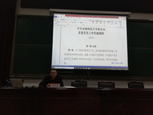 苗山根首先带领学员们研读《中共河南师范大学委员会党员发展工作实施细则(试行)》系统地介绍了共产党员发展的程序,即递交入党申请书、群团组织推优与党员推荐、入党积极分子的确定、培养考察教育、发展对象的确定和考察、预备党员的接收、预备党员教育和考察以及预备党员转正等八个阶段,并重点阐述了申请入党时间、推优时间、定为培养对象时间、入党时间、党员的党龄、转正时间等注意事项。随后他引用习近平总书记对广大青年学子的寄语,以此来勉励全体学员:严于律己,谨遵规矩纪律;严于修身,坚定理想信念;严于修德,锤炼高尚品格;躬于学习,勇攀知识高峰;躬于实践,踏踏实实做事;躬于奉献,提升自我价值。