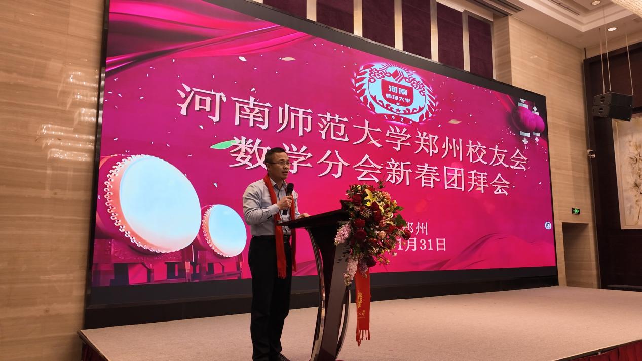 马跃新程,情聚商都,薪火相传,共谱华章。2026 年 1 月 31 日,河南师范大学郑州校友会数学分会 2026 年新春团拜会在郑州正元国际酒店隆重举行。本次活动以叙校友情、聚数学心、谋新发展为主题,汇聚母校领导、各地校友代表及各界嘉宾,共话同窗情谊,共贺新春佳节,共商发展蓝图,活动全程分为学术论坛、年度总结、新春团拜三大阶段,氛围热烈温馨、精彩纷呈。