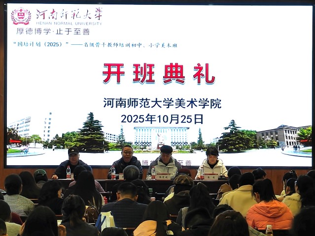 10月25日上午,由教育厅主办,河南师范大学美术学院承办的“国培计划(2025)”——省级骨干教师提升项目中小学美术培训班开班仪式在美术学院多媒体报告厅举行。河南师范大学美术学院院长陈巍、副院长张笑乾、生活班主任张靖、李胜利,以及来自全省各地区的100位培训学员参加了本次开班典礼,本次开班仪式由副院长张笑乾主持。