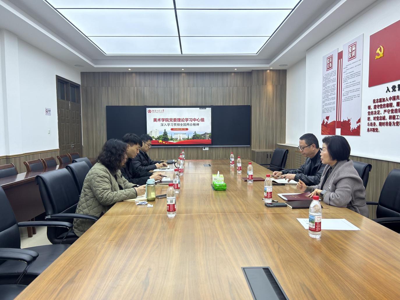 3月17日,美术学院在党员活动室召开党委理论学习中心组学习会,专题学习全国两会精神。会议由院党委书记康淑霞主持,全体班子成员参加学习。