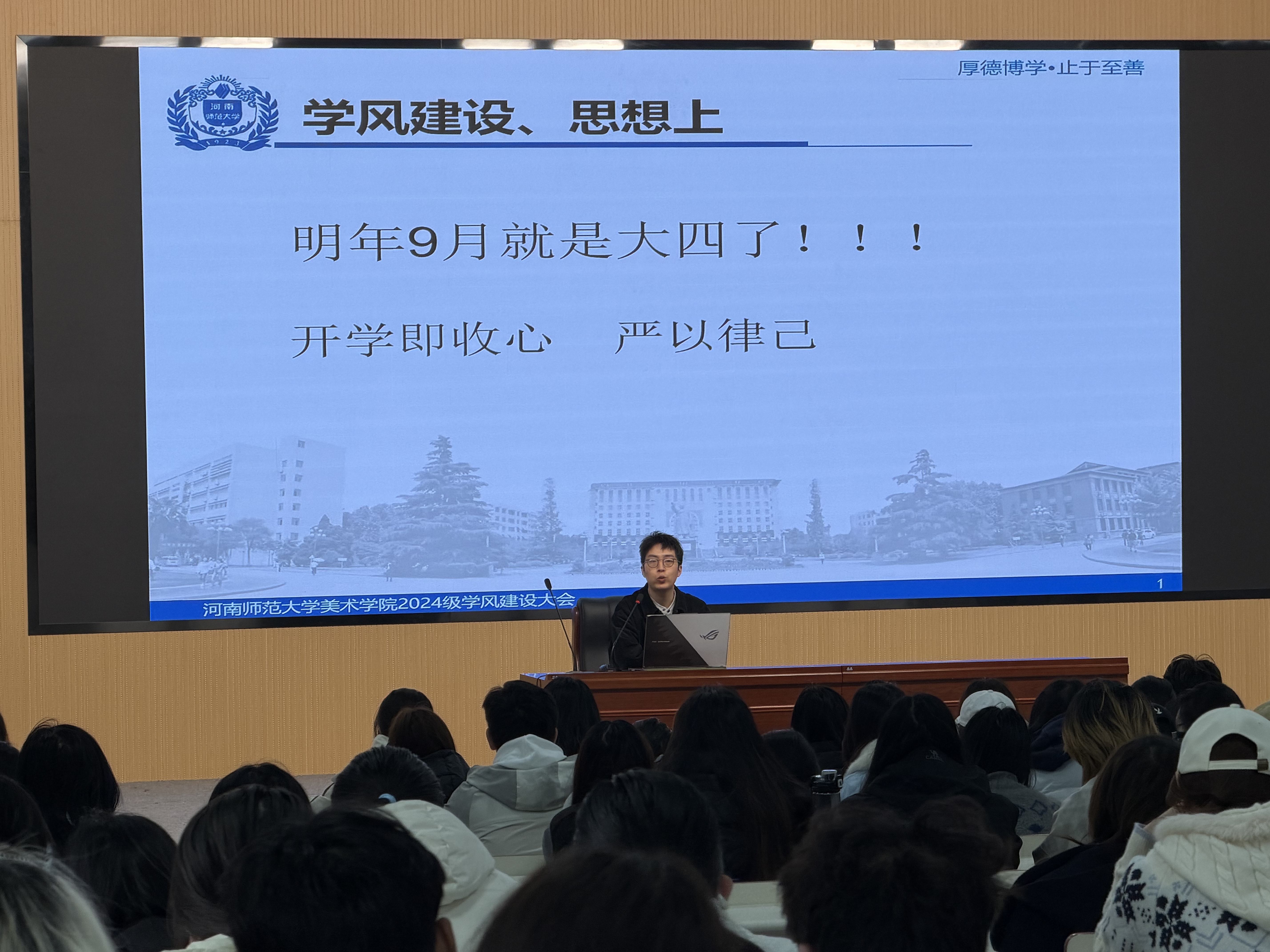 为进一步加强学风建设,引导学生收心归位、明确目标,3月13日上午10点河南师范大学美术学院2024级学生新学期学风建设大会顺利召开。学院辅导员张鹏飞老师主讲,2024级全体本科生参会。