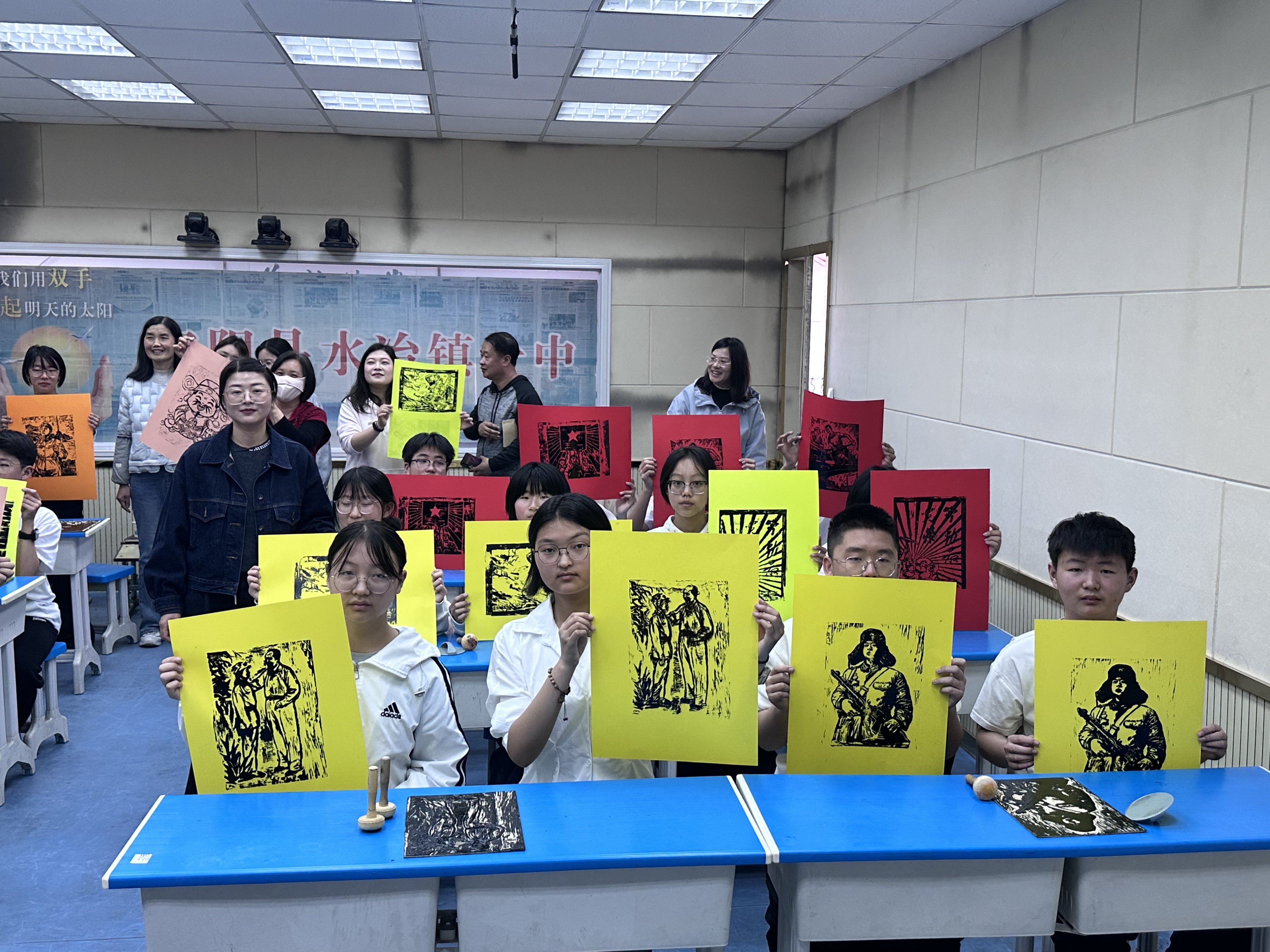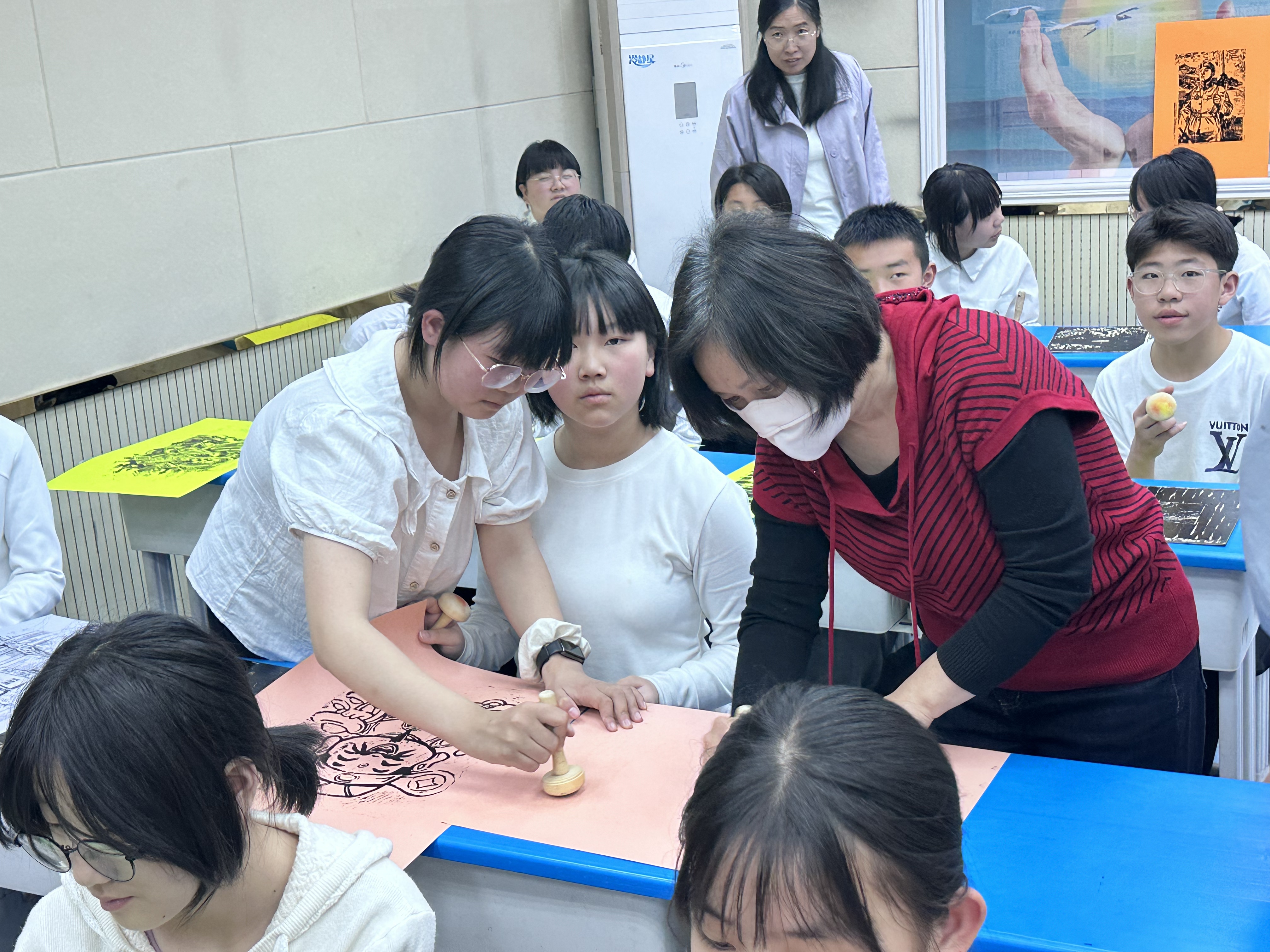 课堂上,美院师生为同学们讲解木版画历史与技法,手把手指导刻版、拓印。同学们以刀为笔、以木为纸,创作出红色主题、民俗风貌等特色鲜明的版画作品,在动手实践中感受传统艺术魅力,提升审美素养。