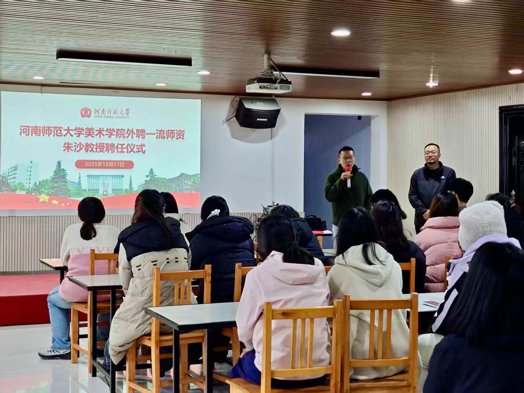 王霄首先代表学院致辞,对朱沙教授莅临我院授课致以热烈欢迎,感谢其对学院教学给予的指导与支持,希望同学们珍惜此次学习机遇,认真学习,积极与朱老师交流。朱沙教授对美术学院的邀请表示感谢,希望能够以此次授课为契机,将自身在绘画方面的理解、感悟、经验与同学们分享交流。随后,王霄代表学院向朱沙教授颁发了河南师范大学兼职教授聘任证书。仪式结束后,朱沙教授为学院师生带来了《下乡写生》课程的专题讲座。朱沙教授分别从“为何要进行写生”“写生的方法”等方面展开讲授,并认真点评了学生作业中的典型问题,同时对此阶段的学习任务与学业要求进行细致剖析,使同学们进一步认识到写生课程对于观察能力与表现能力培养的重要作用。