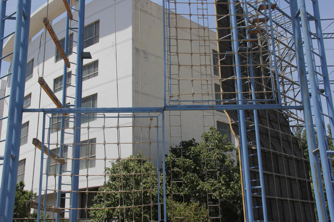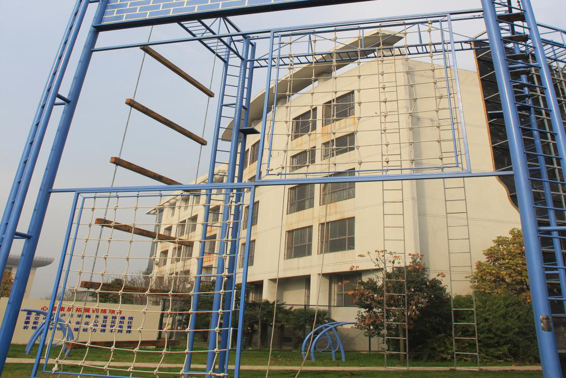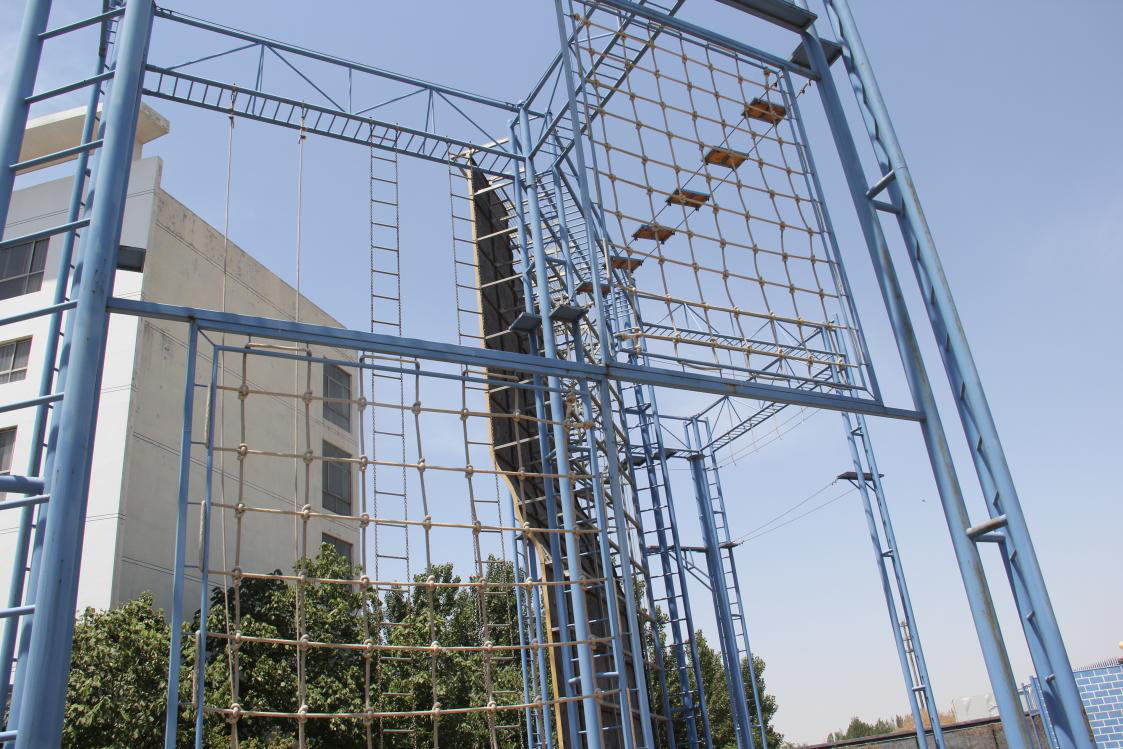高空绳网,属于双人类高空训练项目。该项目的使用方法是两位参训学员做好防护措施后同时往上爬,攀爬到中间位置的杠杆后,在翻到网格的对面一侧,继续往上爬,爬到最高处后速降回地面上即为挑战成功。
