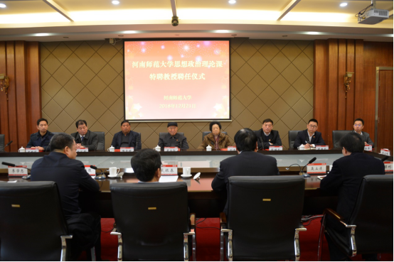 2018年12月21日上午,河南师范大学思想政治理论课特聘请“全国优秀乡镇党委书记”吴金印、“全国十大女杰”刘志华、“全国劳动模范”张荣锁、“全国优秀共产党员”耿瑞先、“中国十大杰出青年农民”裴春亮、“全国道德模范”范海涛、“全国优秀党务工作者”史世领、“吴金印式好干部”赵化录等8位为思想政治理论课第一批特聘教授。