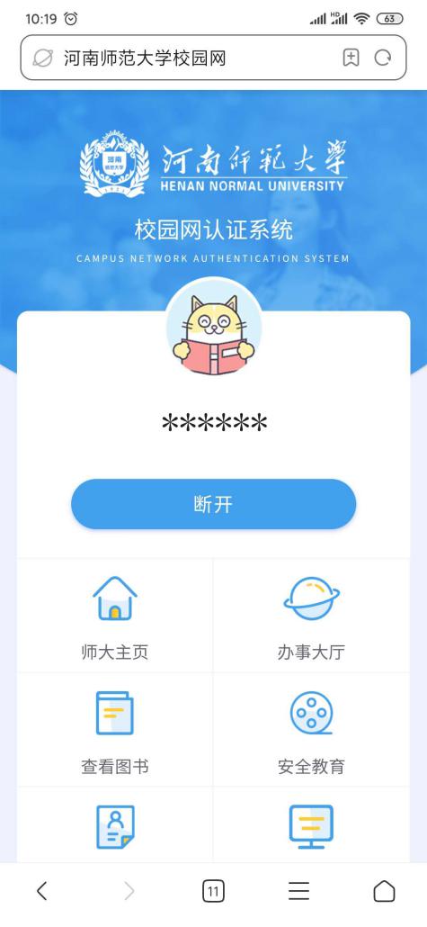如需登出校园网,请在浏览器中输入地址:logout.htu.cn,即会出现如下图所示页面。点击“断开”,即可登出校园网。
