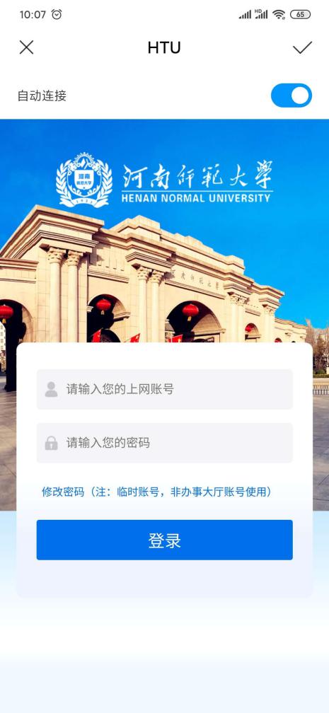 手机接入校园无线网络时,选择HTU(或HTU_5G)信号,即会自动弹出下图所示的上网认证页面。输入账号密码即可登录校园无线网络。