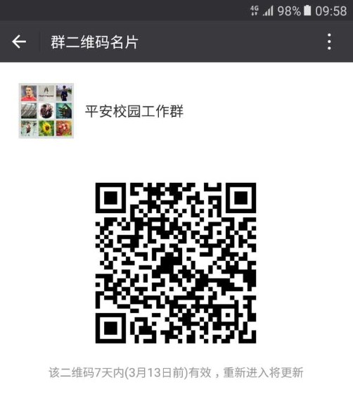 特别说明:经领导认可,为了更好的做好“平安校园建设”工作,学校设立了“平安校园建设”微信工作群(见附件1),要求各单位安全主管、安全员及时加入。今后,有关学校平安校园建设等工作信息、通知也将同时在“平安校园建设”微信工作群发布。具体情况可联系王罡老师:18790582707