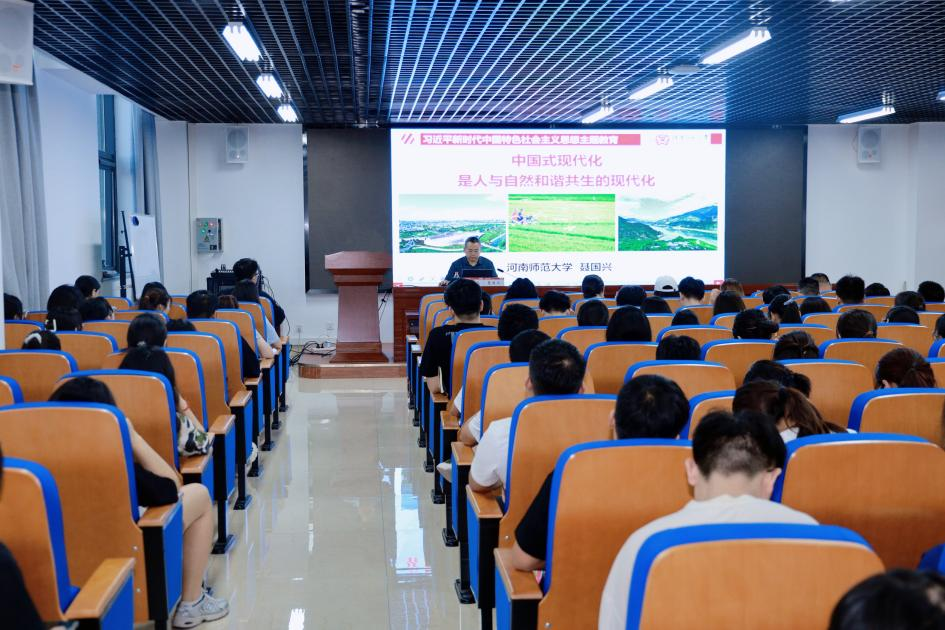 聂国兴从生态与文明,人与自然和谐共生,坚持绿色发展、高质量发展之路等三个方面对习近平新时代中国特色社会主义思想进行了深入解读,他用大量翔实的数据阐述了人与自然关系的内涵和实质、演变与发展,以及党的十八大以来中国生态环境状况实现的历史性转折,并通过展示剖析“人工天河”红旗渠和荒原变林海的“人间奇迹”塞罕坝,深刻阐明了生态文明建设和人与自然和谐共生现代化的哲学逻辑与实践路径。他指出,推动中国式现代化,必须牢固树立和践行“绿水青山就是金山银山”的理念,站在人与自然和谐共生的高度谋划发展,更好地全面推进中华民族的伟大复兴。他鼓励师生,要在自己的专业领域不断深耕,在建设人与自然和谐共生的现代化新征程中勇挑重担,做中国式现代化建设的“排头兵”。