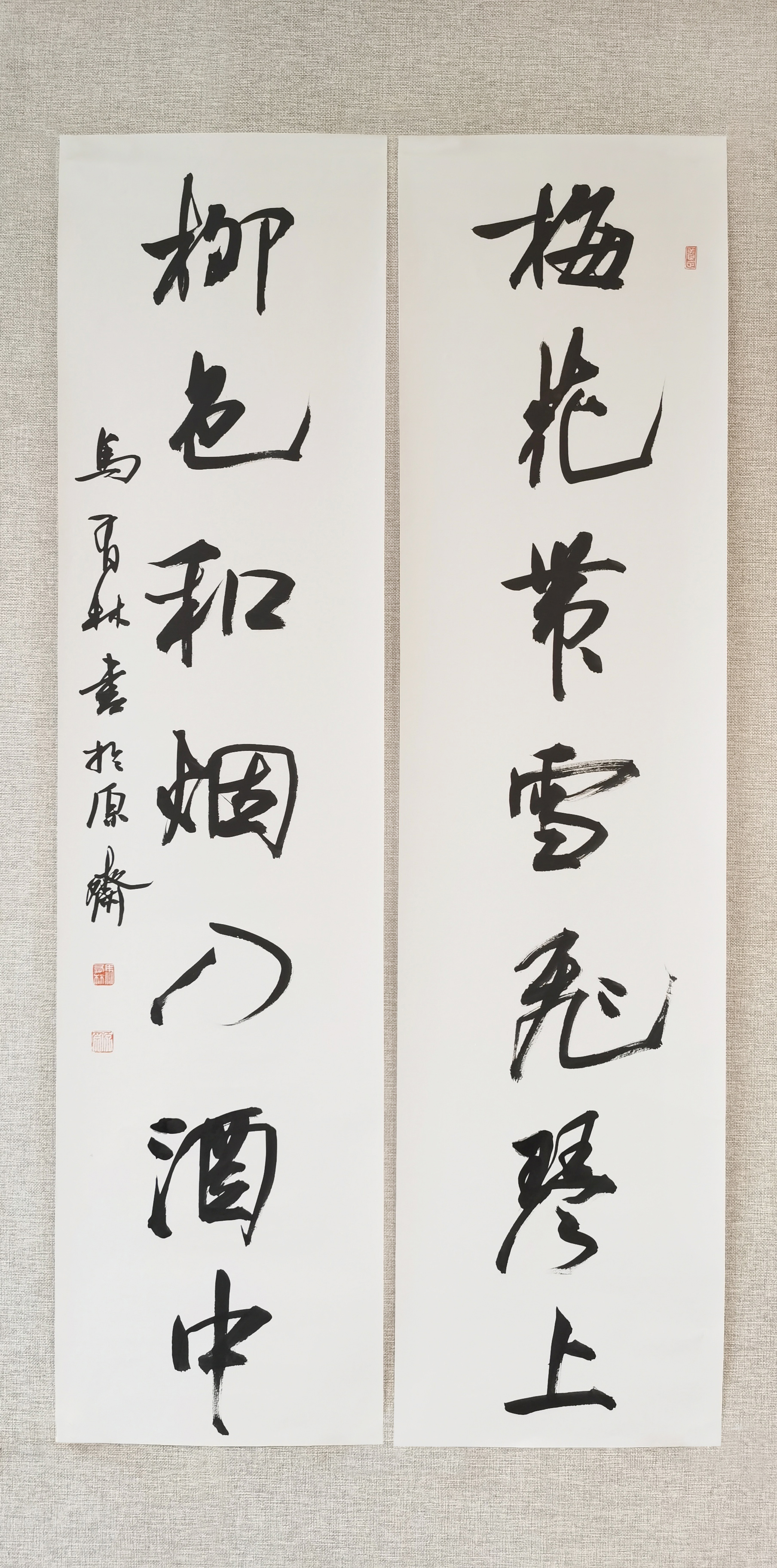 长春师范大学 马有林 《行书对联(梅花带雪飞琴上,柳色和烟入酒中)》
