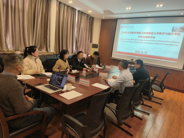 为扎实推进学校国际化办学进程,助力学院提升国际合作水平,2026年1月5日上午,国际合作与交流处处长刘新争、副处长焦克非赴数学与统计学院(密码学院),协助组织该院与澳大利亚莫纳什大学(Monash University)数学学院的合作交流研讨会。莫纳什大学数学学院院长Warwick Tucker教授、副院长Kais Hamza教授,我校数学与统计学院(密码学院)执行院长黄广月、副院长崔鲁宾、青年教师代表参加了此次活动。