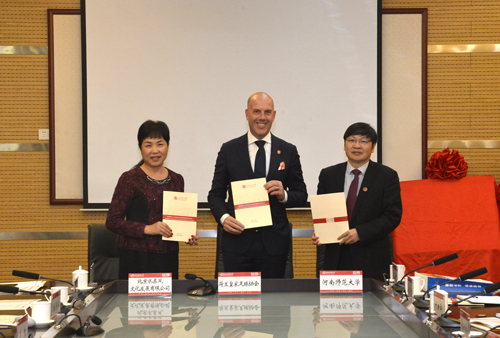 10月24日上午,首届中荷青少年校园足球国际研讨会在我校勤政楼第三会议室举行。教育部体卫艺司体卫处副处长樊泽民,新乡市副市长李刚,全国学校体育联盟(足球项目)主席刘志云,河南省青少年校园足球工作领导小组办公室主任郭蔚蔚,荷兰皇家足球协会秘书长吉斯·德容,校党委书记赵国祥,党委副书记陈广文,校党委常委、副校长李学志,校党委常委、纪委书记张尚字等领导出席开幕式。开幕式由陈广文主持。