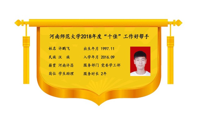 许鹏飞,男,汉族,河南许昌人,1997年11月出生,共青团员,体育学院2016级体育教育专业本科生,现担任党委学工部学生处助理班班长,服务时长2年。