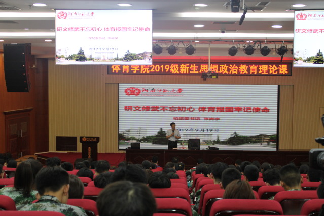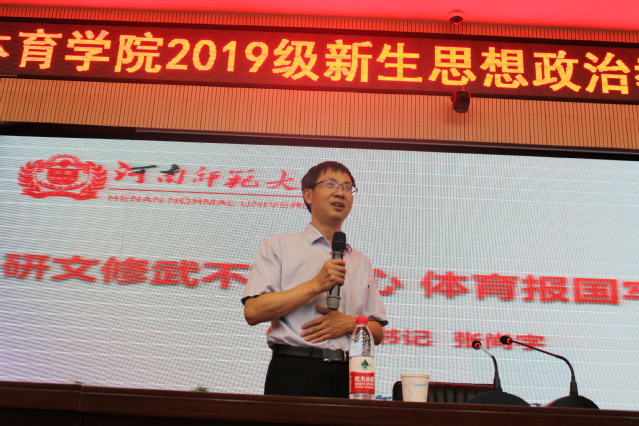 为深入贯彻落实习近平总书记对学校思想政治教育的重要讲话精神,把立德树人根本任务落实到位,9月19日晚7时,校纪委书记张尚字在东区思政平台为我院2019级新生讲授思想政治教育课。校学生资助中心主任赵红杰、体育学院有关负责人等出席并聆听了此次授课。课堂由体育学院党委书记岳贤锋主持。