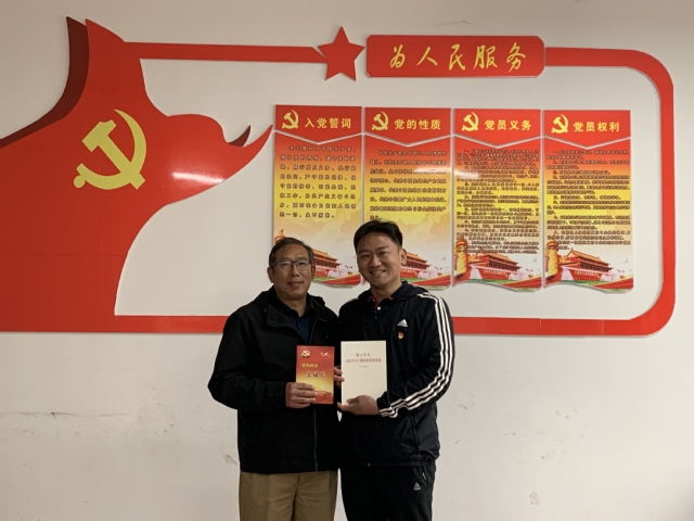 3月19日是申怀松同志的政治生日。上午九点半,院党委书记王允在学院党建活动室向申怀松同志赠送“政治生日”贺卡和“政治生日”礼物——《深入学习习近平关于教育的重要论述》,王允代表学院党委感谢申怀松同志工作以来为学院的建设和发展做出的贡献,用实际行动展现了党员勇于担当的奉献精神。他希望申怀松同志一如既往的发挥先锋模范作用,为学院的发展奉献力量。申怀松同志回顾了自己的入党故事,重温了入党誓词,并发表政治生日感言,他感谢组织的关怀和认可,表示将继续感恩党、听党话,不忘初心跟党走,牢记使命献余热。