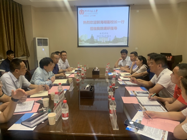 6月30日下午,校党委常委、副校长郭海明到体育学院调研指导工作,校长办公室、教务处、学生处相关负责人陪同调研。学院党政领导班子及教研室主任、科级干部和辅导员代表参加了座谈会。座谈会由体育学院党委书记王允主持。