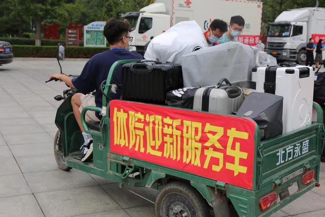 应疫情防控要求,新生在志愿者的引导下,经过场所码、行程码出示,返校回执、身份验证等信息核验进入校园,入校后完成入校核酸检测后,伴随着“体院爱心三轮车”的接送车辆前往报到点进行入学报到。
