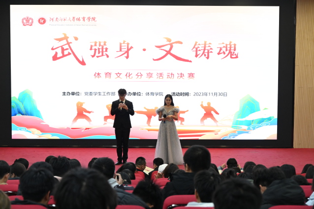 11月30日晚,河南师范大学第八届 “阅享经典•书香师大”读书系列活动之“武强身·文铸魂”体育文化分享活动决赛在东校区思政平台举行。校党委组织部副部长王令耀、校党委学工部副部长蒋晋光、校团委副书记杨上上、体育学院党委副书记王芳、文学院刘志芳、体育学院司幸伟应邀出席并担任本次决赛的评委,各学院相关负责人、辅导员和学生代表共同参加此次活动。