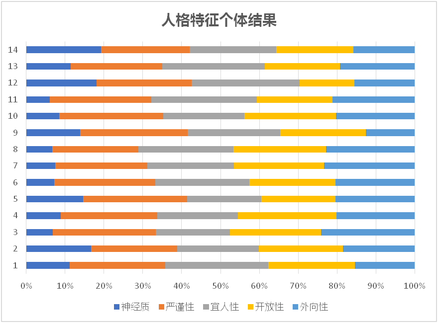 如图1所示,14名员工总体呈现25%的严谨性特征,23%的宜人性特征,22%的开放性特征,19%的外向性特征,以及11%的神经质特征。结果显示,公司员工总体呈现严谨性、宜人性和开放性的人格特征,而神经质和外向性的特征不明显。