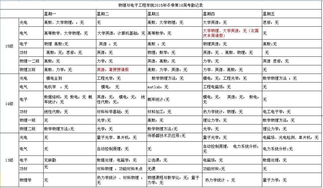 物理与电子工程学院2015年秋季第十八周考勤记录