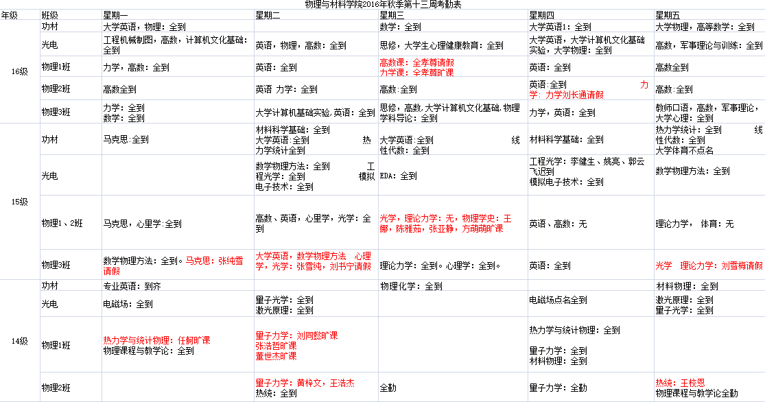 物理与材料科学学院2016年秋季第十三周考勤记录