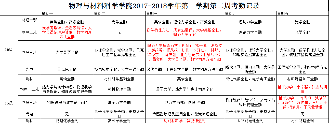2017-2018学年第一学期第二周考勤记录