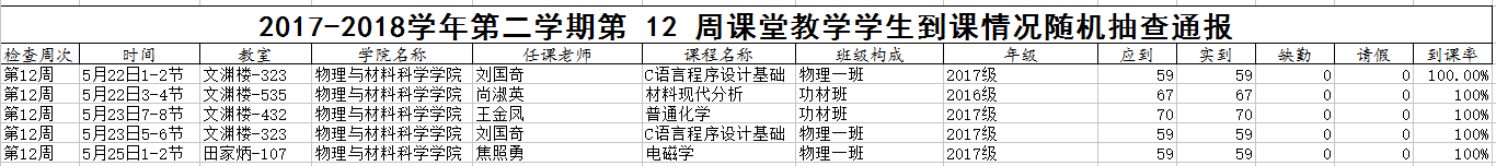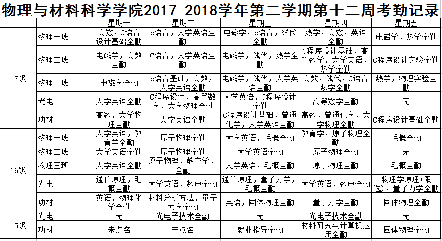 2017-2018学年第二学期第十二周考勤记录