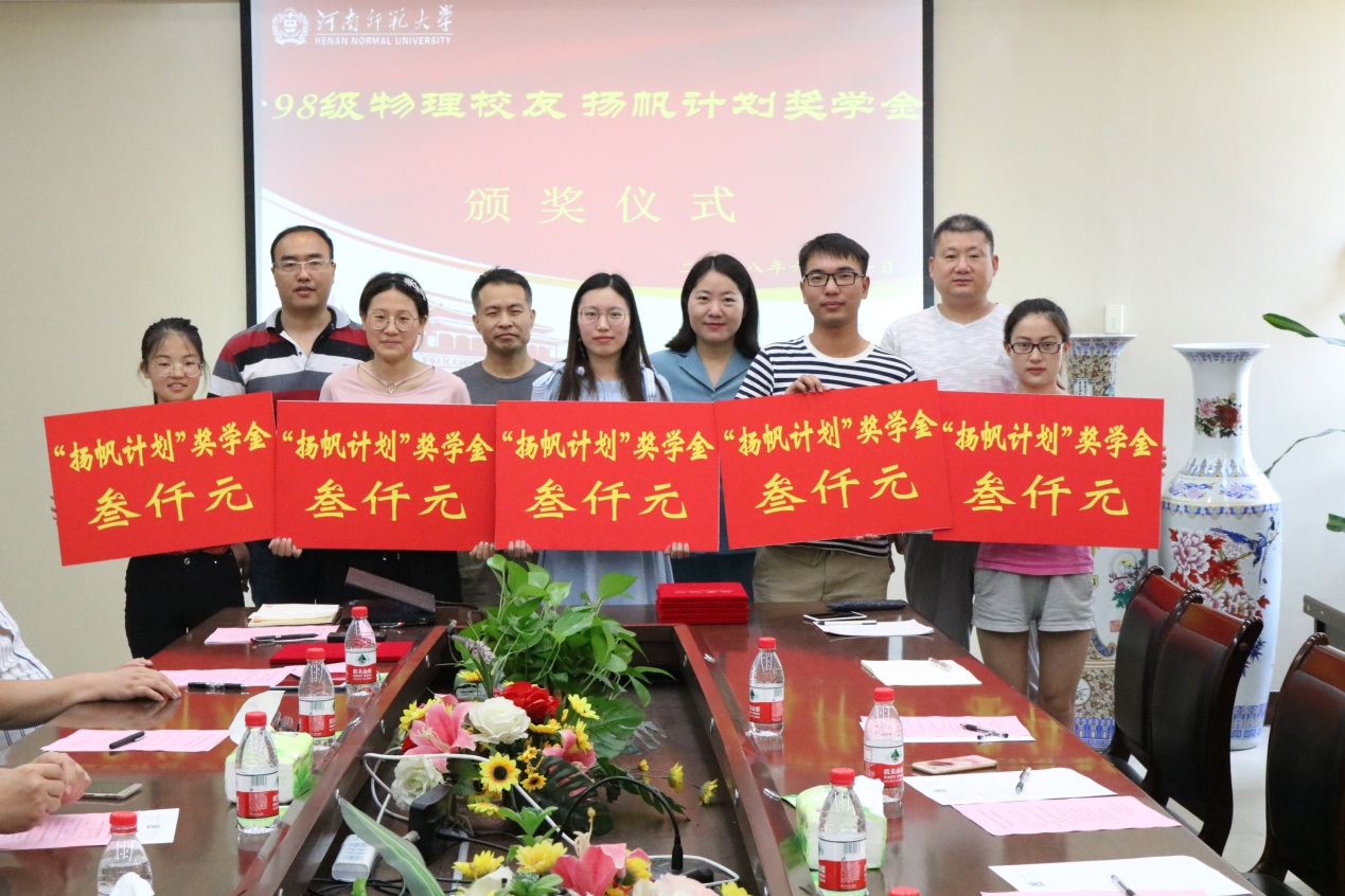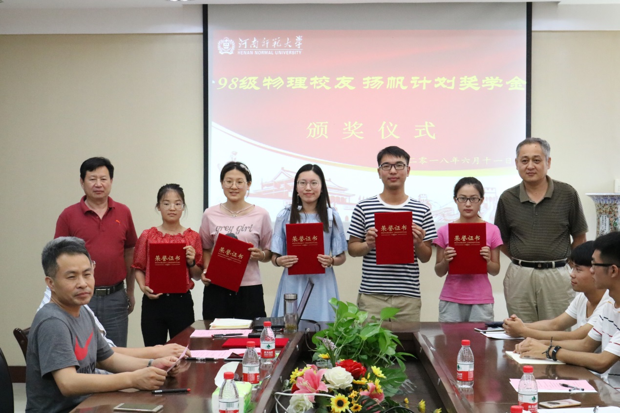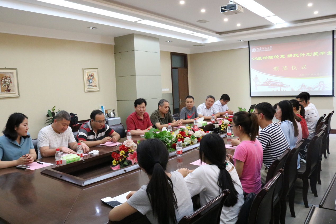 忆当年,求学师大难忘师长培育恩;再回首,回馈母校助力学子扬帆梦。6月11日中午,物理与材料科学学院于物理北楼会议室举行物理98级校友“扬帆计划”奖学金颁奖仪式。“扬帆计划”委员会代表于勉、张克磊、王海英,学院党委书记李清富,副书记陈明银,98级辅导员李立新,研究生工作秘书、2014级本科生辅导员王春,院团委负责人王丹云,2014级获奖学生,各年级优秀学生代表共同参加本次颁奖典礼。颁奖仪式由党委书记李清富主持。