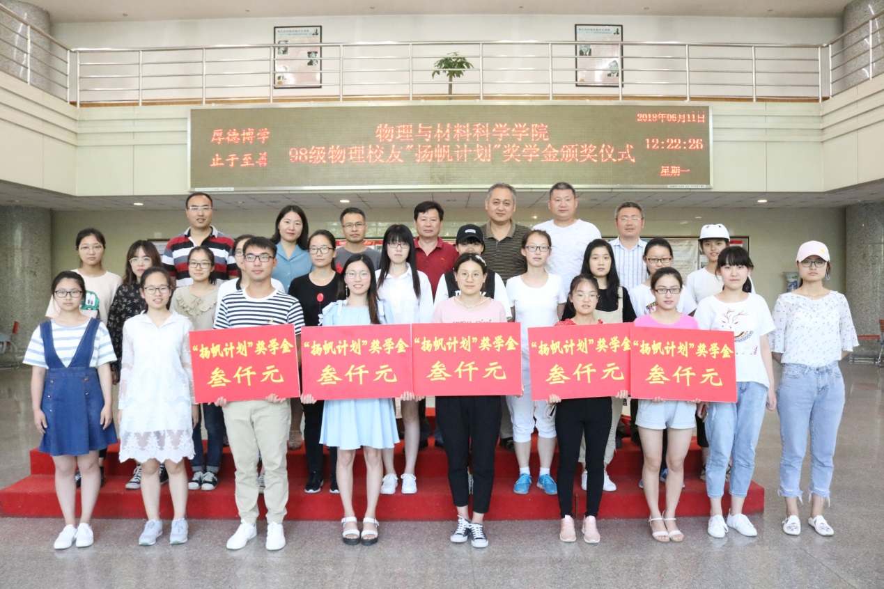 本基金由1998级物理学毕业生发起和筹措,旨在对物理与材料科学学院物理学专业品学兼优、基础扎实、锐意进取、理想高远的优秀本科毕业生学生进行奖励,鼓励学弟学妹们认真学习、刻苦工作、努力奋斗、坚定信仰,成为对物理学专业、学院、学校和社会发展有重大贡献和有影响力的人才。本奖学金第一期实施时间为 2018 年至 2022 年,四年共筹集资金6万元,每年对符合条件的 5 名优秀毕业生进行奖励,每名学生奖学金为 3000 元。第一期结束后将继续该奖学金的运作,并在有条件的情况下扩大资金数量和获奖比例。