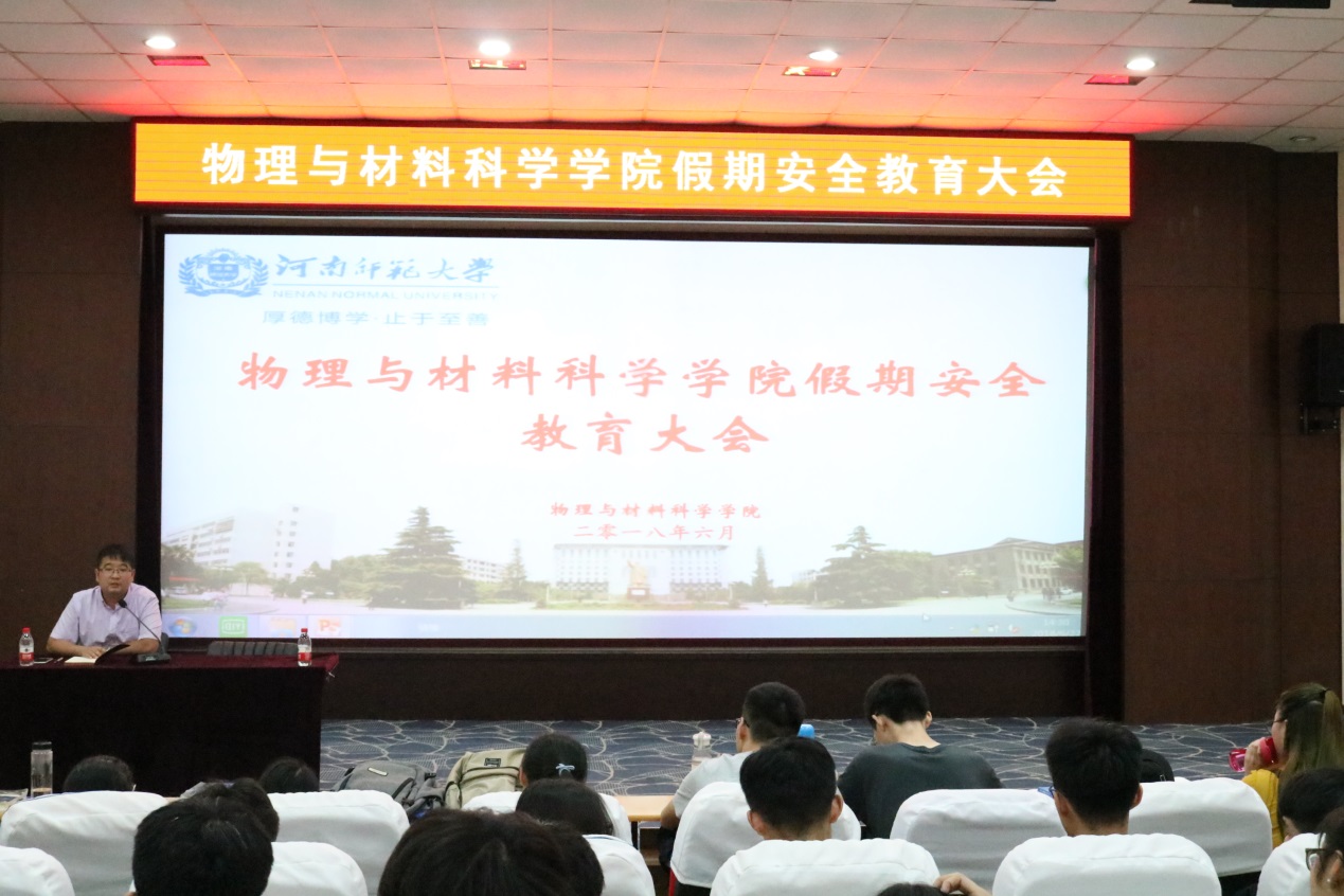 为提升学生安全意识,普及安全常识,全力做好暑期学生安全防范工作,6月28日,物理与材料科学学院在物理北楼三楼报告厅开展了学生暑期安全教育大会,学院团委负责人、2016和2017级辅导员王丹云以及各年级学生代表参加了教育大会。