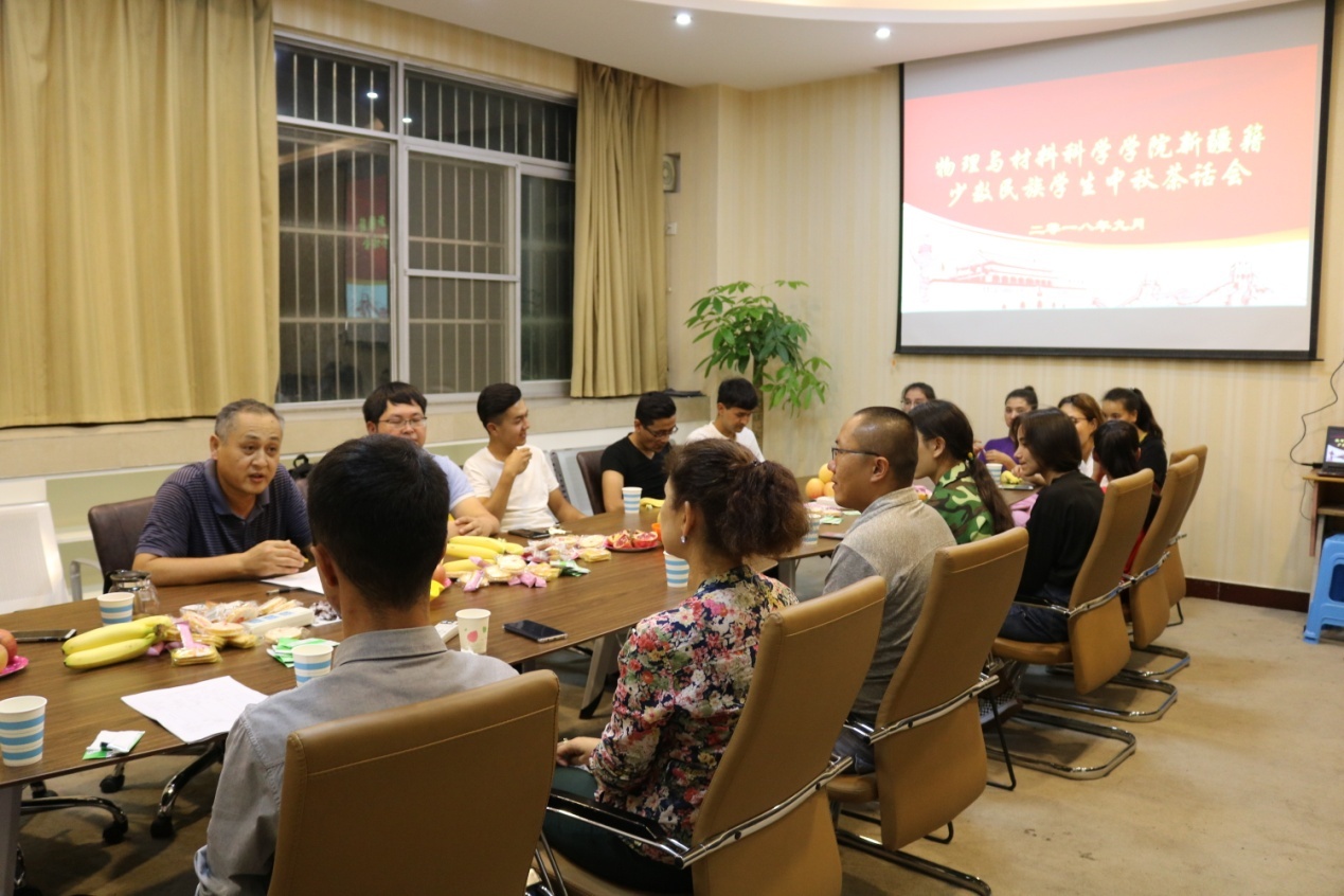 中华民族一家亲,同心共筑中国梦。9月21日晚,我院于物理北楼大学生成长发展辅导工作室举办新疆籍少数民族学生中秋茶话会。学院党委副书记陈明银,团委负责人王丹云,辅导员张浩兴、熊子瑞,内派教师蔡超、艾比巴·卡地尔、艾克拜尔·热合曼以及学院全体新疆籍少数民族学生共同参加茶话会。