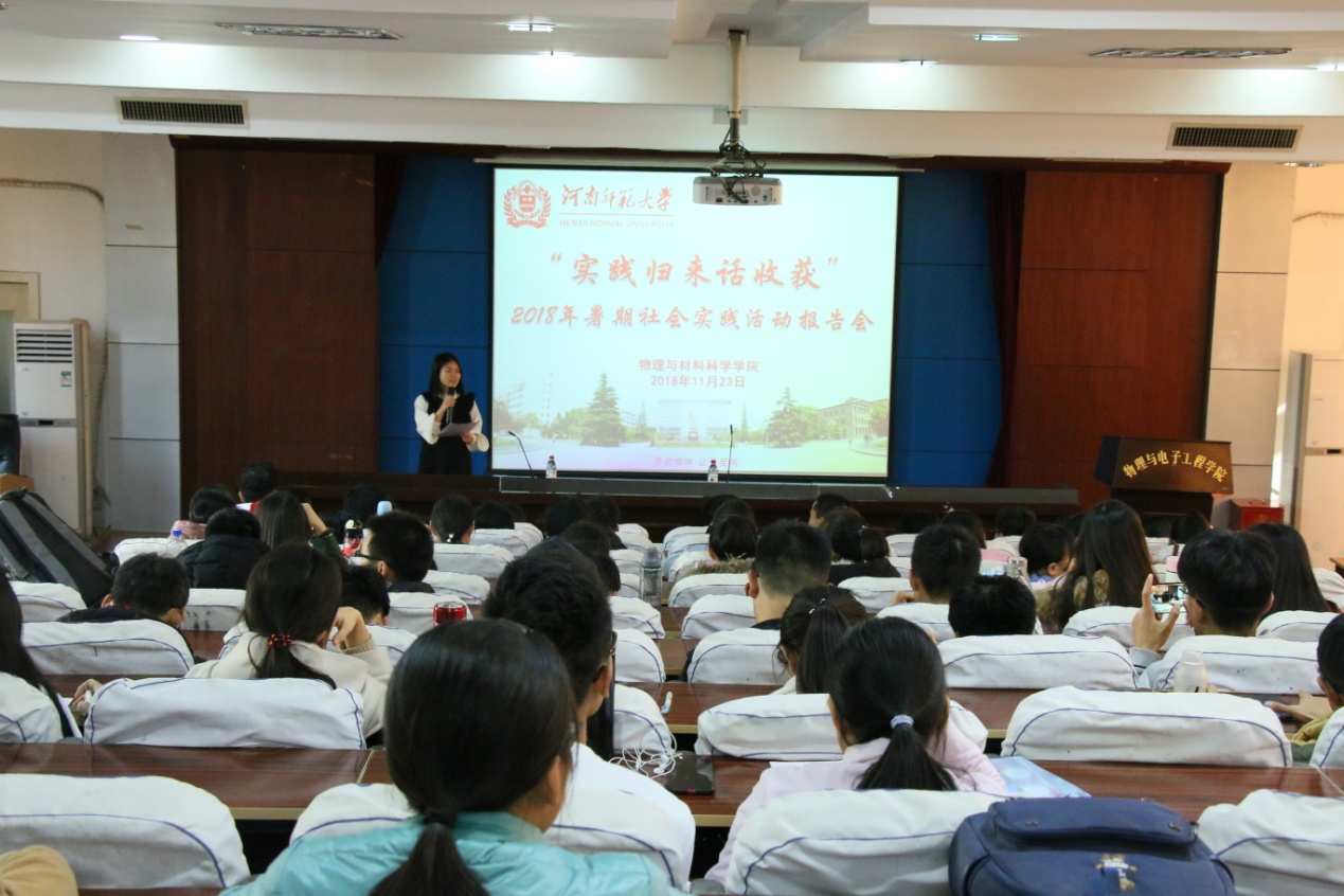 为积极引导学生在投身实践中了解国情、关注民生、奉献社会,11月30日我院在物理南楼二楼报告厅举行2018年暑假三下乡实践成果展示报告会。报告会由物理与材料科学学院学生会主席李星童主持,四支实践团队和2017级、2018级学生代表共两百多人参加。