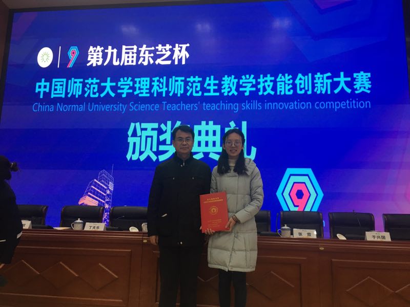 12月25日至28日在浙江师范大学举办的第九届“东芝杯•中国师范大学理科师范生教学技能创新大赛“中,我院2016级物理学专业张玉莹同学以优异成绩荣获二等奖,指导教师为侯新杰教授和马春旺教授。